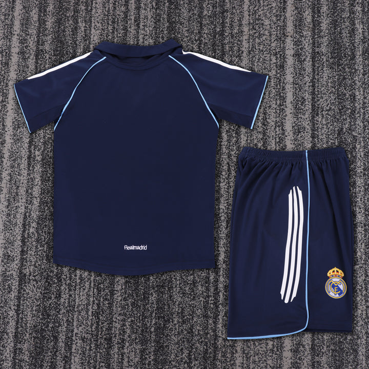 Kit Infantil Real Madrid Retrô Away 05/06 Camisa + Shorts Adidas Unissex - Azul Escuro