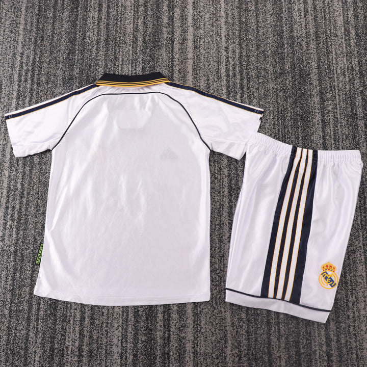 Kit Infantil Real Madrid Retrô Home 98/99 Camisa + Shorts Kelme Unissex - Branca